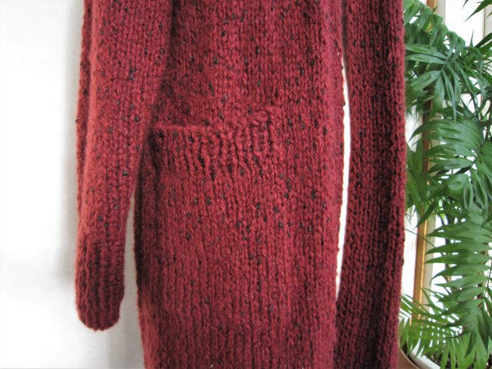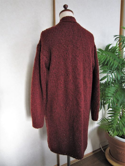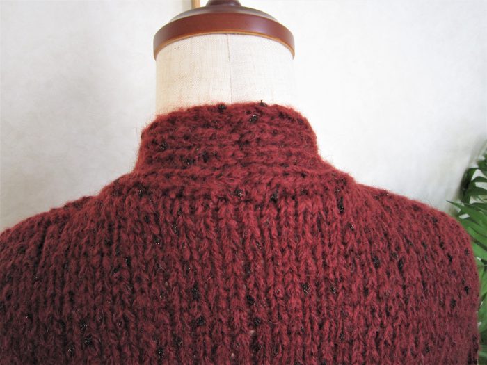 前立てを身頃と一緒に編み、衿も続けて編みました。後襟は被せはぎにし、身頃とは目と段のはぎにしました。 後側
